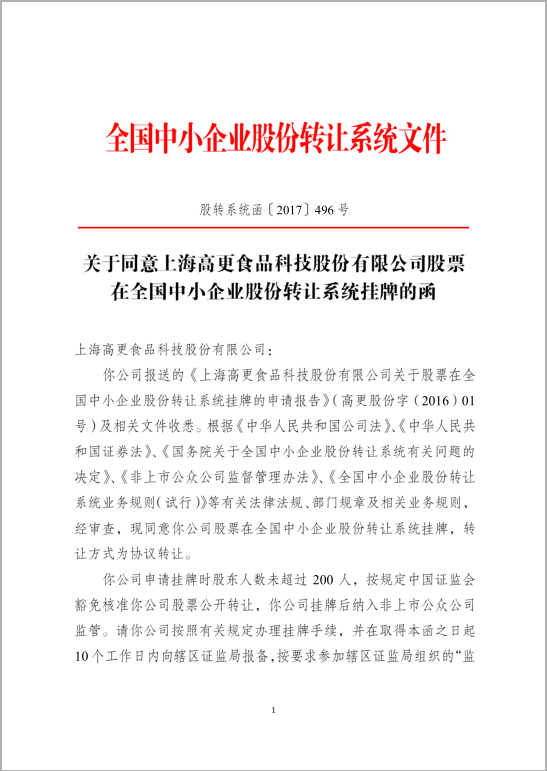 • 上海高更食品科技股份有限公司上市通知(公函)