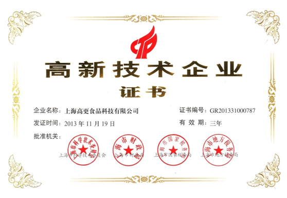 2013年11月19日,上海高更荣获由上海市科学技术委员会、上海市财政局、上海市国家税务局及上海市地方税务局联合颁发的“高新技术企业”证书。至此,上海高更食品科技有限公司正式被认定为国家级高新技术企业。